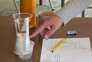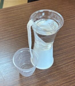 次にティッシュペーパーを水面の高さと同じ高さのところをハサミで切ると水はコップの外に流れ出るでしょうか,という問題をしました。